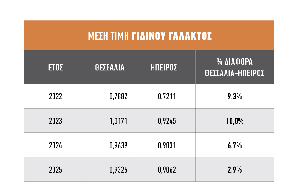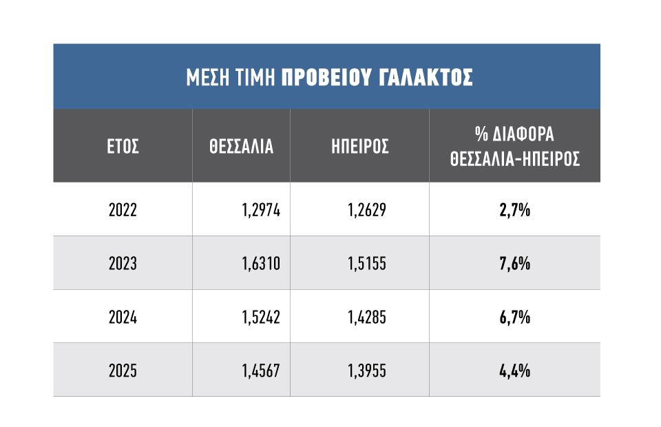Η διαµόρφωση των τιµών στις δύο ζώνες έχει άµεση σχέση, τόσο µε τον ηγετικό ρόλο που διατηρούν τα Ελληνικά Γαλακτοκοµεία στη Θεσσαλία, όσο και µε το επίπεδο των κτηνοτροφικών εκµεταλλεύσεων που έχουν δηµιουργηθεί, πάντα σε στενή σχέση µε τον εν λόγω όµιλο επιχειρήσεων. Αντίθετα, η φθίνουσα πορεία που είχε τα τελευταία χρόνια η ∆ωδώνη, αντανακλάται σε σηµαντικό βαθµό και στις τιµές παραγωγού (βλέπε σχετικό πίνακα). Η αντιστροφή της πορείας των τιµών και κατ΄επέκταση της πορείας των εκµεταλλεύσεων θα είναι στοίχηµα για τους επίδοξους αγοραστές.