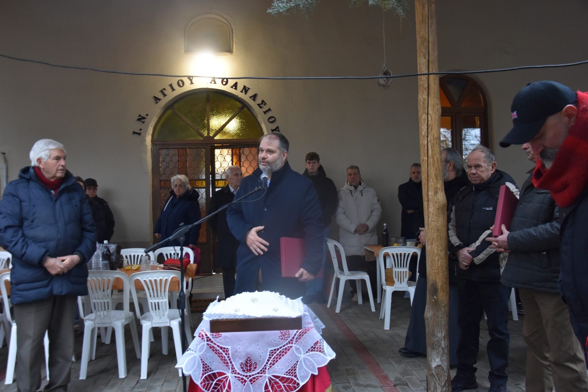 Το πρωί τελέστηκε η Θεία Λειτουργία στον Ιερό Ναό Αγίου Αθανασίου και ακολούθησε το καθιερωμένο παραδοσιακό γεύμα, σύμφωνα με το έθιμο. Κατά τη διάρκειά του πραγματοποιήθηκε η δημοπράτηση κοτόπουλων και αρνιών, με τα έσοδα να διατίθενται για τη συντήρηση των ναών του χωριού, συνεχίζοντας μια πρακτική προσφοράς και συλλογικής ευθύνης που διατηρείται αναλλοίωτη στον χρόνο.