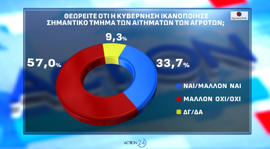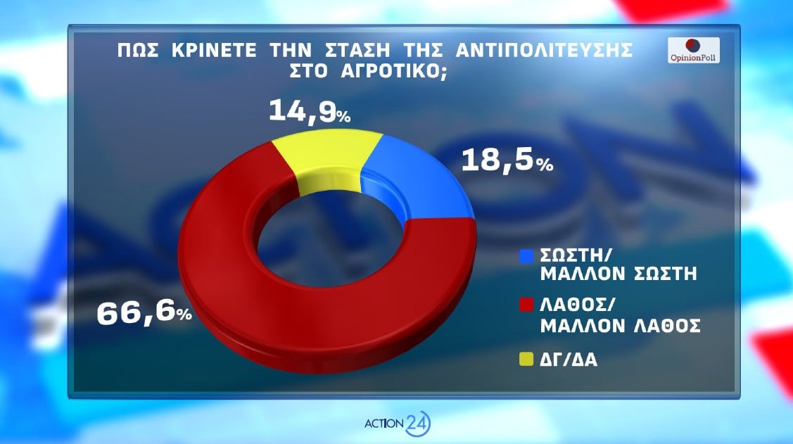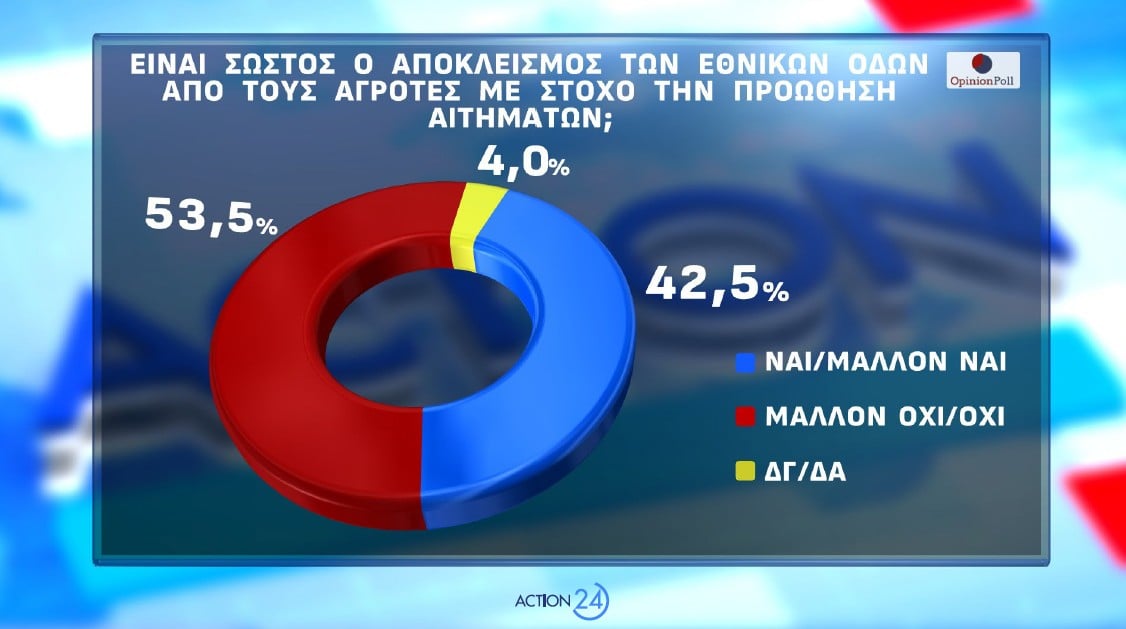 Το 53.5% θεωρούν ότι δεν είναι σωστό να κλείνει τις εθνικές οδούς οποιαδήποτε επαγγελματική κατηγορία , όπως για παράδειγμα οι αγρότες , για να προωθήσει κανείς αιτήματά της, με το 42.5% να το θεωρεί σωστό. Το 33.7% θεωρεί ότι η Κυβέρνηση στα πλαίσια των δυνατοτήτων της ικανοποίησε σημαντικό τμήμα των οικονομικών αιτημάτων, με το 57% να έχει αντίθετη άποψη.