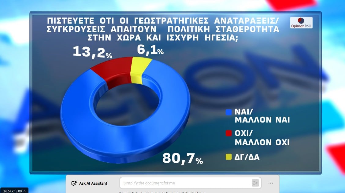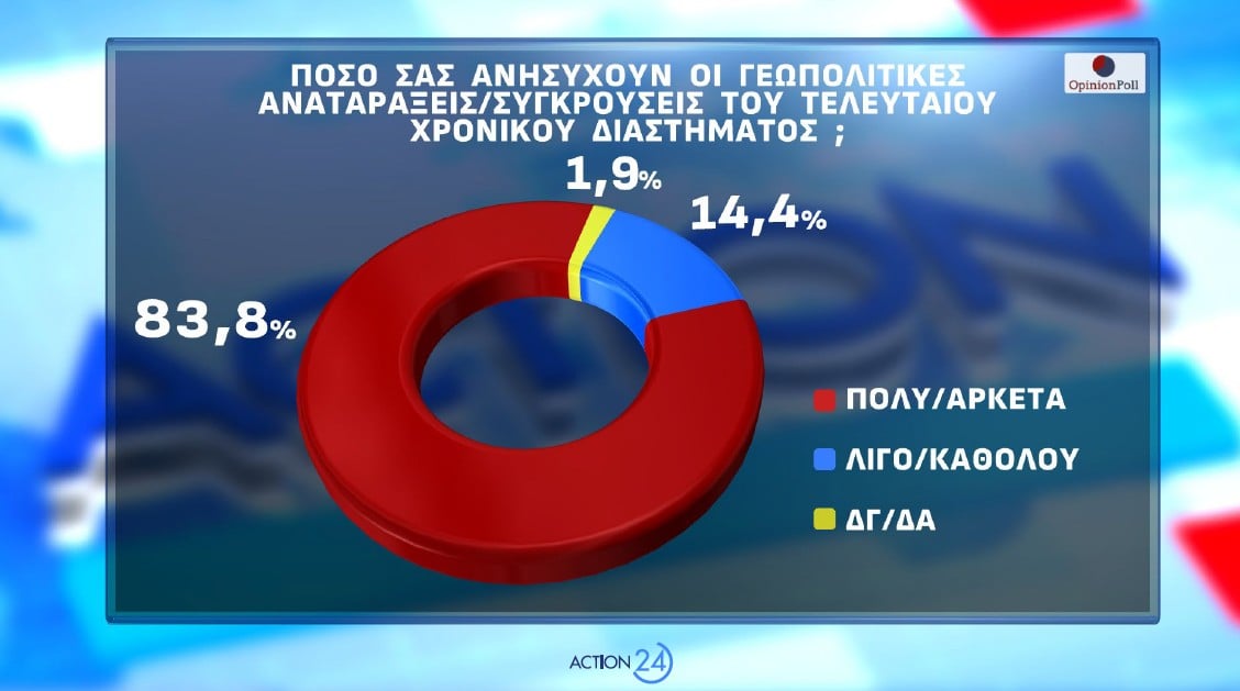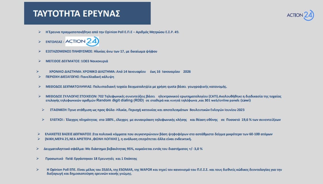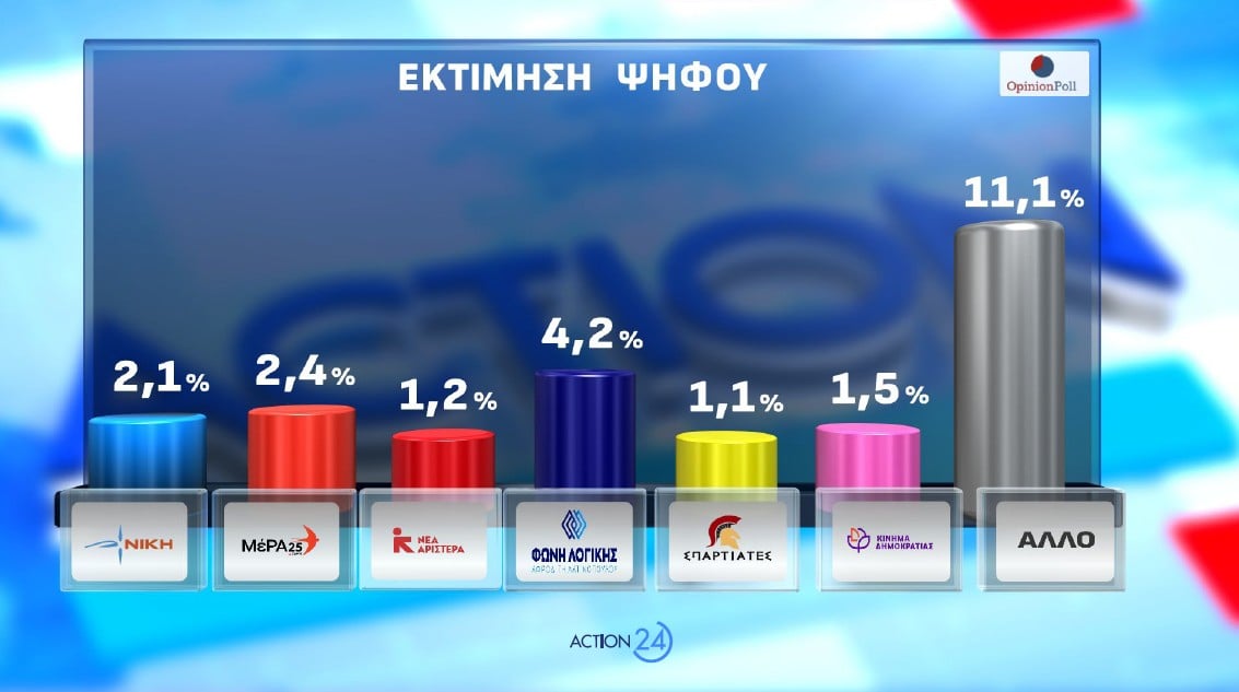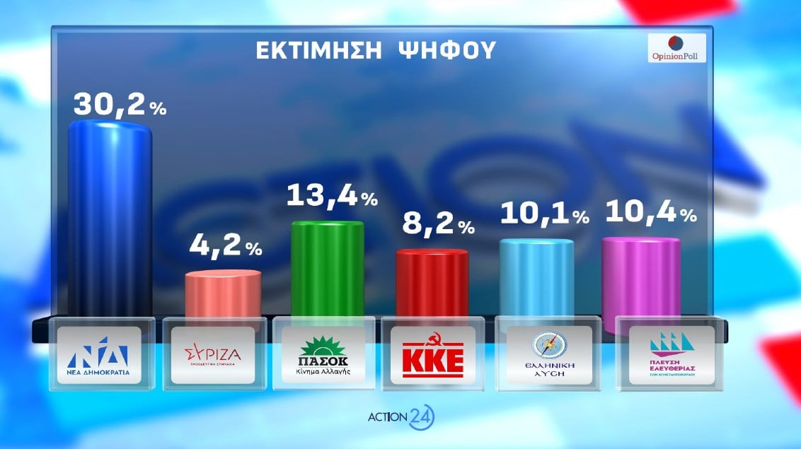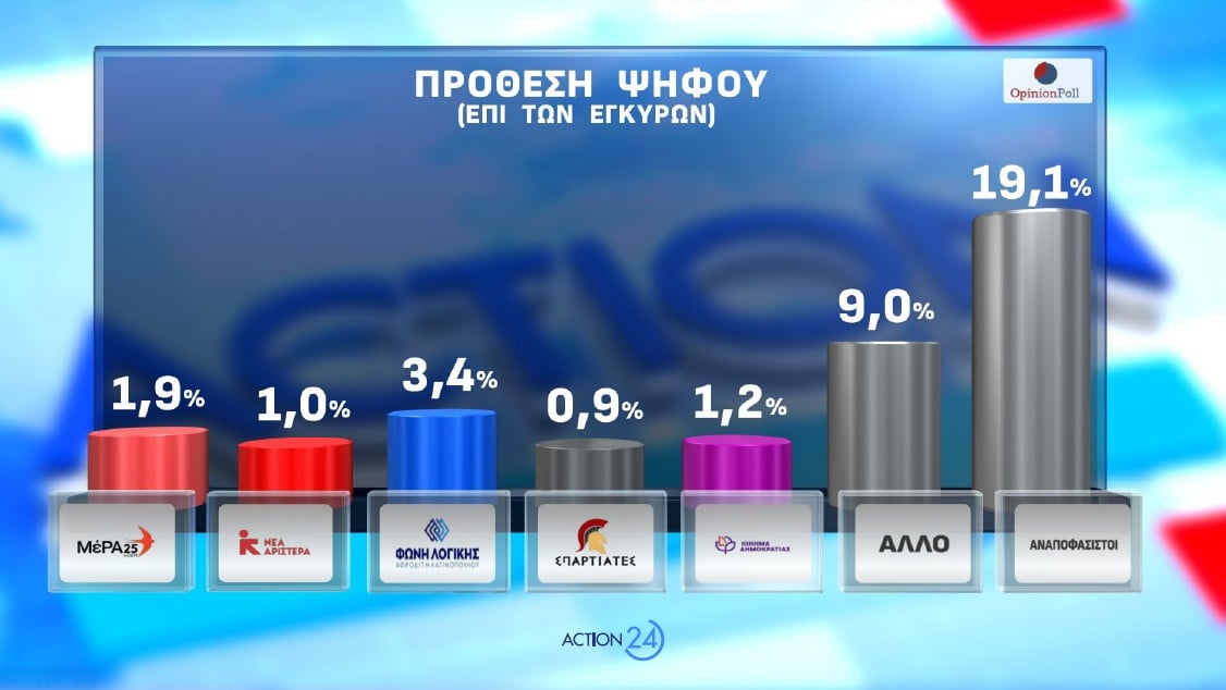 Σύμφωνα με την έρευνα της Opinion Poll, για λογαριασμό του Action24, στην πρόθεση ψήφου η ΝΔ 24.4%, το ΠΑΣΟΚ 10.8%, η Πλεύση Ελευθερίας 8.5%, η Ελληνική Λύση 8.1%, το ΚΚΕ 6.6%, ο ΣΥΡΙΖΑ 3,4%, η Φωνή Λογικής 3.4%, το ΜέΡΑ25 1.9%, η Νίκη 1.7%, το Κίνημα Δημοκρατίας 1.2%, η Νέα Αριστερά 1%, οι Σπαρτιάτες, 0.9%, ΑΛΛΟ ΚΟΜΜΑ 9%, και 19.1% Αναποφάσιστοι.