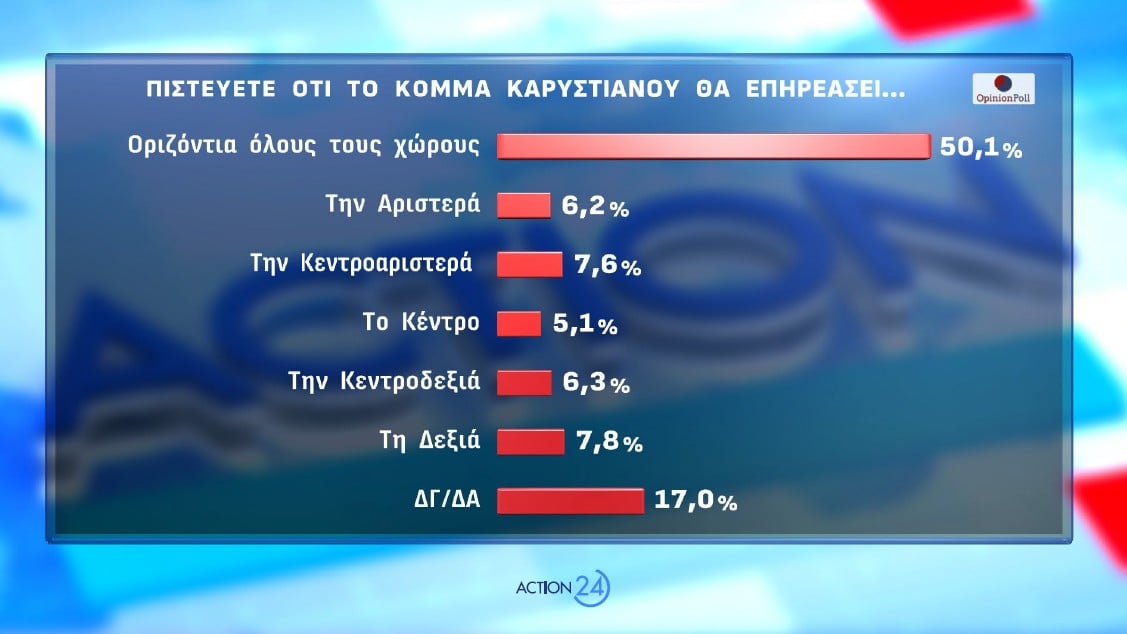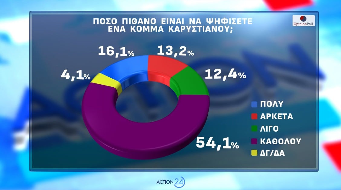 Το 16.1% δηλώνει πολύ πιθανό να ψηφίσει ένα « κόμμα Καρυστιανού» και το 13.2% αρκετά πιθανό. Το άθροισμα της δυνητικής ψήφου αθροίζεται στο 29.3% . Λίγο πιθανό απαντά το 12.4% και καθόλου πιθανό το 54.1%. Αν δούμε το πολύ πιθανό, τα μεγαλύτερα ποσοστά εμφανίζονται στην ΕΛΛΗΝΙΚΗ ΛΥΣΗ με 27.1%, στην ΝΙΚΗ με 24%, στον ΣΥΡΙΖΑ με 23.7% και την ΠΛΕΥΣΗ ΕΛΕΥΘΕΡΙΑΣ με 18.5%. Στα κόμματα αυτά αν δούμε πολύ και αρκετά πιθανόν συνολικά , τα ποσοστά είναι: ΕΛΛΗΝΙΚΗ ΛΥΣΗ 41.7%, ΝΙΚΗ 44%, ΣΥΡΙΖΑ 44.9%, ΠΛΕΥΣΗ ΕΛΕΥΘΕΡΙΑΣ με 40.7%.