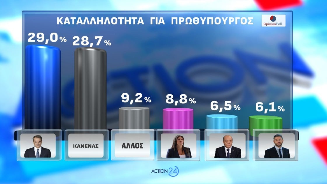 Στην καταλληλότητα για Πρωθυπουργός πρώτος μακράν εμφανίζεται ενισχυμένος οριακά ο Κ. Μητσοτάκης με 29% ( 28.5%). Ακολουθεί ο ΚΑΝΕΝΑΣ με 28.7%( 31.9%), ο ΑΛΛΟΣ με 9.2%, η Ζωή Κωνσταντοπούλου με 8.8%( 9.1%) , ο Κ. Βελόπουλος με 6.5%( 7.5%) , ο Ν. Ανδρουλάκης με 6.1% ( 7.1%), ο Δ. Κουτσούμπας με 2.4%, Α. Λατινοπούλου με 2% , ο Σ. Φάμελλος με 1.6%, ο Σ. Κασσελάκης με 1.1% κ.λ.π