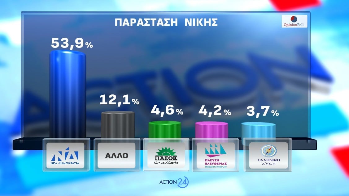 Στην Παράσταση Νίκης η Ν.Δ προηγείται με 53.9% και ακολουθούν το ΑΛΛΟ ΚΟΜΜΑ με 12.1%, ΠΑΣΟΚ 4.6%, ΠΛΕΥΣΗ ΕΛΕΥΘΕΡΙΑΣ 4.2%, η ΕΛΛΗΝΙΚΗ ΛΥΣΗ με 3.7% κ.λ.π