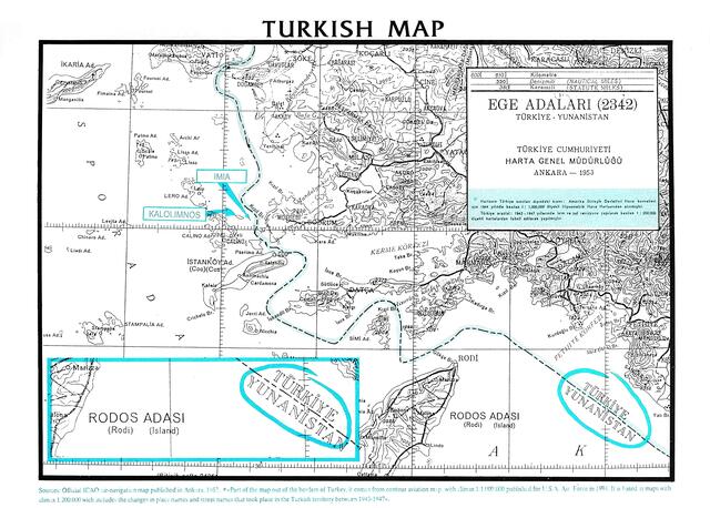 Xάρτης του Διεθνούς Οργανισμού Πολιτικής Αεροπορίας που εκδόθηκε στην Αγκυρα το 1953. Μέρος του χάρτη εκτός των τουρκικών συνόρων προέρχεται από τους χάρτες που είχε δημοσιεύσει η Πολεμική Αεροπορία των ΗΠΑ το 1994