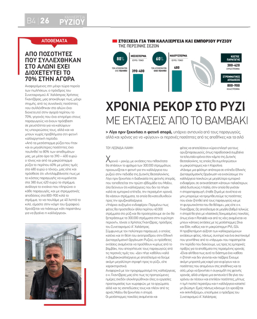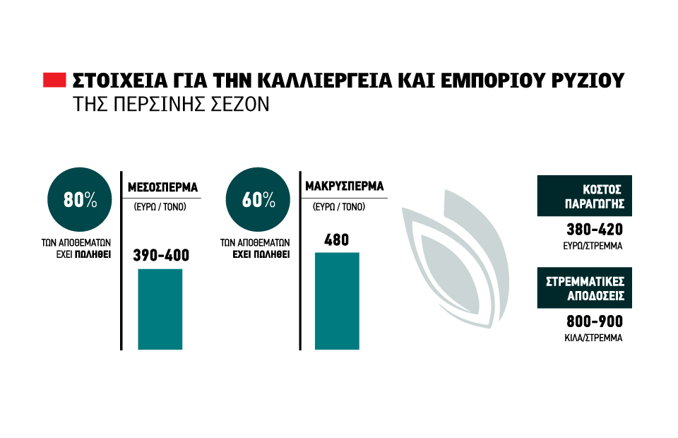«Από τα µεσόσπερµα ρύζια που ήταν και οι µεγαλύτερες ποσότητες έχει πουληθεί το 80% των αποθεµάτων µας, µε µέσο όρο τα 390 – 400 ευρώ ο τόνος και από τα µακρύσπερµα ρύζια το περίπου 60% µε µέσες τιµές στα 480 ευρώ ο τόνος», µας είπε και πρόσθεσε ότι «Αντιλαµβάνεστε πως µε το κόστος παραγωγής να κυµαίνεται στα 380 έως 420 ευρώ το στρέµµα, ανάλογα το ενοίκιο που πληρώνει ο κάθε παραγωγός, και µε στρεµµατικές αποδόσεις στα 800-900 κιλά το στρέµµα, το να πουλάµε µε 40 λεπτά το κιλό, είµαστε στην κόψη του ξυραφιού. Χρειάζεται να πιάσουµε κάτι παραπάνω για να βγαίνει η καλλιέργεια».