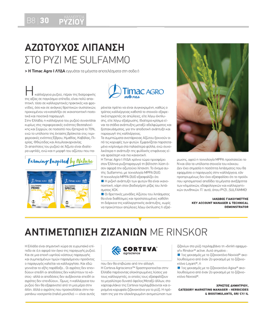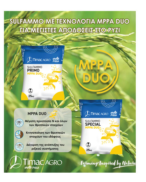 Η Timac Agro I ΛΥ∆Α χρόνια τώρα προσφέρει στον Έλληνα ρυζοπαραγωγό τη βέλτιστη λύση όσον αφορά την αζωτούχο λίπανση. Το όνοµα αυτής: Sulfammo, µε τεχνολογία MPPA DUO.