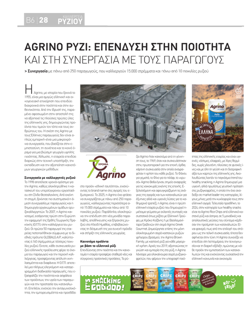 Αρχές του 2019, αξιοποιώντας τη γνώση και εµπειρία της στο ρύζι, η Agrino λάνσαρε µια ολοκαίνουρια σειρά ρυζογκοφρετών, που φέρουν την υπογραφή ποιότητας της ελληνικής εταιρίας και είναι υγιεινές, νόστιµες, ελαφριές, µε λίγες θερµίδες, χωρίς γλουτένη, πλούσιες σε φυτικές ίνες και µε όλη τη γεύση και τη διατροφική αξία των καρπών της ελληνικής γης. Ακολουθώντας λοιπόν το παγκόσµιο trend του healthy snacking, η Agrino δηµιουργεί µια υγιεινή, αλλά πρωτίστως γευστική πρόταση στις ρυζογκοφρέτες, η οποία την έχει αναδείξει σε market leader της κατηγορίας, λίγους µήνες µετά την κυκλοφορία τους στην ελληνική αγορά. Τελευταία προσθήκη, το 2024, στην κατηγορία των healthy snacks είναι τα Agrino Rice Chips από ελληνικό καστανό ρύζι και όσπρια, σε 5 µοναδικές και απολαυστικές γεύσεις που σύντοµα κέρδισαν την προτίµηση των καταναλωτών. Είναι φανερό, πως από την επιλογή του σπόρου ως την τελική συσκευασία, τίποτα δεν αφήνεται στην τύχη. Η Agrino συνεχίζει να επενδύει στη λεπτοµέρεια, την τεχνογνωσία και τη διαρκή εξέλιξη, τιµώντας µε κάθε προϊόν την εµπιστοσύνη των καταναλωτών της και ενισχύοντας ουσιαστικά την ελληνική κοινωνία και οικονοµία.