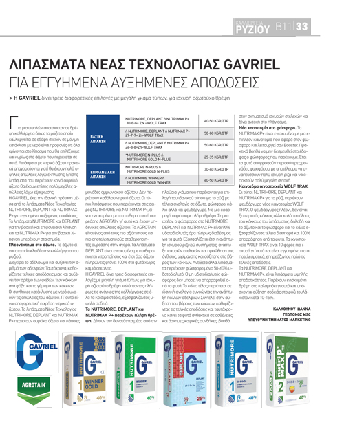 Η GAVRIEL, έχει την ιδανική πρόταση µέσα από τα λιπάσµατα Νέας Τεχνολογίας NUTRIMORE, DEPLANT και NUTRIMAX P+ για εγγυηµένα αυξηµένες αποδόσεις. Τα λιπάσµατα NUTRIMORE και DEPLANT για την βασική και επιφανειακή λίπανση και τα NUTRIMAX P+ για την βασική λίπανση υπερέχουν στα σηµεία: