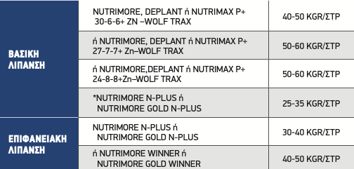 Τα NUTRIMORE, DEPLANT και NUTRIMAX P+ παρέχουν πλήρη θρέψη. ∆ίνουν την δυνατότητα µέσα από την πλούσια γκάµα που παρέχονται για επιλογή του ιδανικού τύπου για το ρύζι µε τέλεια αναλογία σε άζωτο, φώσφορο, κάλιο αλλά και ψευδάργυρο. Με µια εφαρµογή παρέχουµε πλήρη θρέψη. Σηµειωτέον, ο φώσφορος στα NUTRIMORE, DEPLANT και NUTRIMAX P+ είναι 90% υδατοδιαλυτός άρα πλήρως διαθέσιµος για τα φυτά. Εξασφαλίζεται έτσι η ανάπτυξη ισχυρού ριζικού συστήµατος, ανάπτυξη ισχυρών στελεχών και προώθηση της άνθισης, ωρίµανσης και αύξησης στο βάρος των κόκκων. Αντίθετα άλλα λιπάσµατα περιέχουν φώσφορο µόνο 50-60% υδατοδιαλυτό. Ο µη υδατοδιαλυτός φώσφορος δεν µπορεί να απορροφηθεί από τα φυτά. Το κάλιο τέλος περιέχεται σε ιδανική αναλογία ευνοώντας την ανάπτυξη πολλών αδελφιών. Συντελεί στην αύξηση του βάρους των κόκκων, καθορίζοντας τις τελικές αποδόσεις και ταυτόχρονα κάνει τα φυτά ανθεκτικά σε ασθένειες και άσχηµες καιρικές συνθήκες, βοηθά στον σχηµατισµό ισχυρών στελεχών και δίνει αντοχή στο πλάγιασµα.