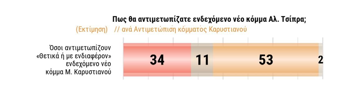 Με την Μαρία Καρυστιανού να έχει ουσιαστικά προαναγγείλει την ίδρυση κόμματος ένα 31% το βλέπει «με ενδιαφέρον και θετικά». Ο Αλέξης Τσίπρας, που κρατά ακόμα κλειστά τα χαρτιά του, συνεχίζει να συγκεντρώσει υπολογίσιμα ποσοστά με ένα 19% να απαντά πως αντιμετωπίζει «με ενδιαφέρον και θετικά» ένα ενδεχόμενο νέο κόμμα υπό τον πρώην πρωθυπουργό.