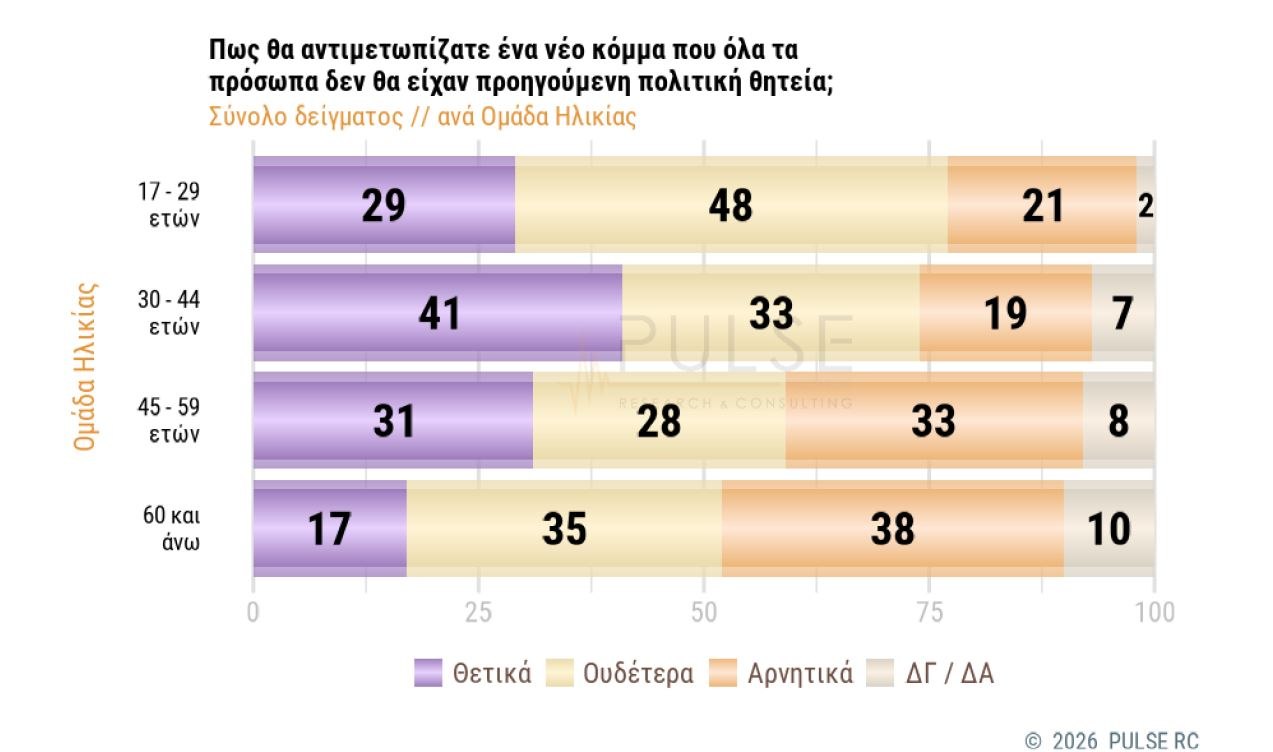 Στο ερώτημα «πως θα αντιμετωπίζατε ένα νέο κόμμα που όλα τα πρόσωπα δεν θα είχαν προηγούμενη πολιτική θητεία», ανά ηλικιακή ομάδα, έχουμε τα εξής ευρήματα: