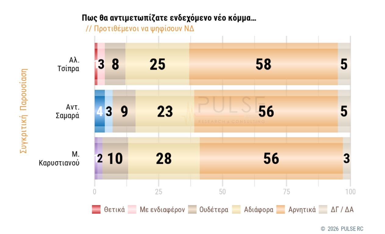 Στη δημοσκόπηση της Pulse για λογαριασμό του ΣΚΑΪ, οι συμμετέχοντες, μεταξύ άλλων καλούνται να απαντήσουν για τις συζητήσεις που γίνονται για ενδεχόμενη δημιουργία νέων κομμάτων με το 16% να το αποδίδει «στις αδυναμίες της κυβέρνησης», το 23% «στις αδυναμίες της αντιπολίτευσης» και το εμφατικό 46% «και στους δύο λόγους».