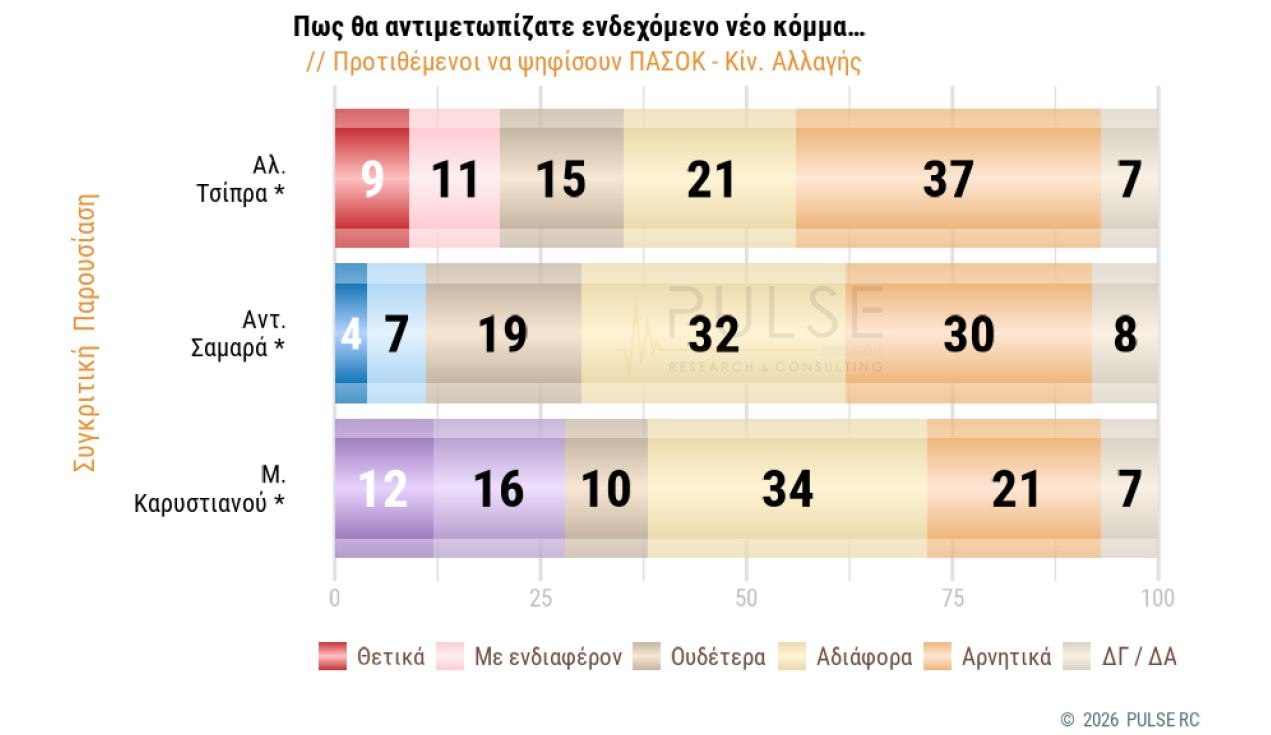 Στο ΠΑΣΟΚ η «δεξαμενή» μεγαλώνει με το 12% να βλέπει θετικά ένα «κόμμα Καρυστιανού» και το 9% ένα «κόμμα Τσίπρα». Το κόμμα Καρυστιανού συγκεντρώνει επίσης 20% θετικές γνώμες μεταξύ των ψηφοφόρων της Πλεύσης Ελευθερίας και 11% στη λεγόμενη «γκρίζα ζώνη». Το «κόμμα Τσίπρα» λαμβάνει ένα εξίσου σημαντικό 8% από τη «γκρίζα ζώνη».