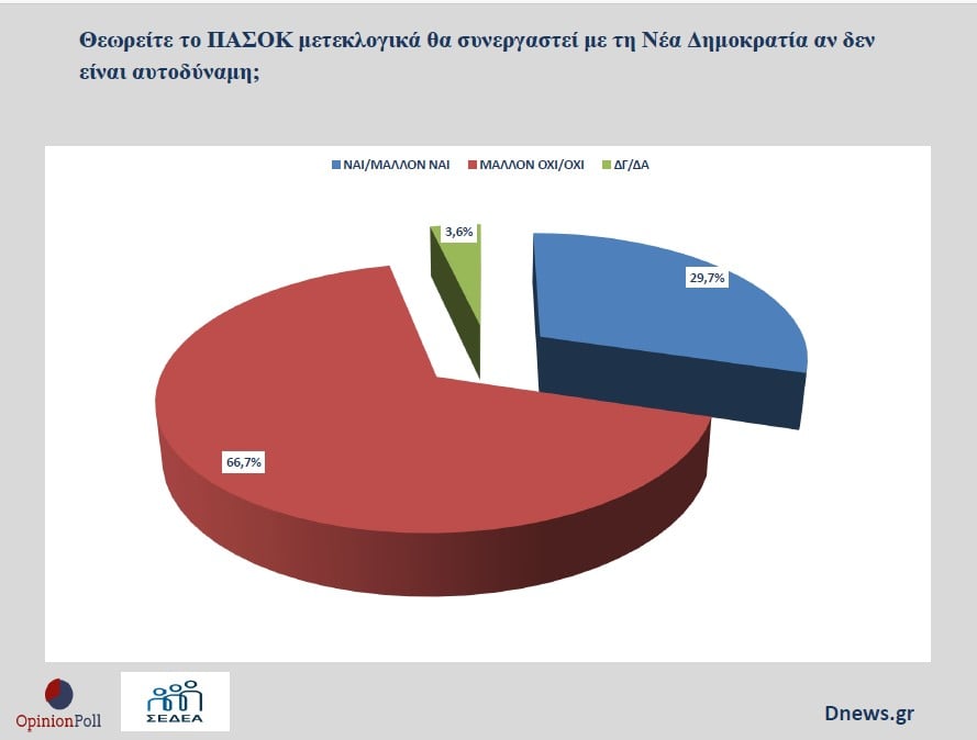 Παρά τις κατηγορηματικές διαψεύσεις της ηγεσίας, το 29,6% των ψηφοφόρων θεωρεί πιθανή μια μετεκλογική συνεργασία Νέα Δημοκρατία – ΠΑΣΟΚ, εφόσον δεν υπάρξει αυτοδυναμία. Το 66,7% απορρίπτει αυτό το σενάριο, όμως η καχυποψία παραμένει ισχυρή.