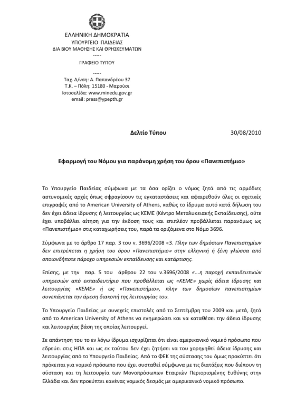 Οι εξαπατημένοι φοιτητές, αλλά και φορείς όπως ο Πανελλήνιος Φαρμακευτικός Σύλλογος, απευθύνθηκαν στη Διεύθυνση Εποπτείας Φορέων Επαγγελματικής Κατάρτισης και Δια Βίου Μάθησης του Υπουργείου Παιδείας, ενώ αυτεπάγγελτη έρευνα είχε κάνει και ο Συνήγορος του Καταναλωτή. Τόσο το Υπουργείο, όσο και η ανεξάρτητη Αρχή, εξέδωσαν ανακοινώσεις το καλοκαίρι του 2010 όπου ξεκαθάριζαν πως το «American University of Athens» (η μετονομασία και μετενσαρκωση του κολλεγίου) δεν αποτελεί «ακαδημαϊκά και επαγγελματικά αναγνωρισμένο πανεπιστήμιο στην Ελλάδα» κι η χρήση του όρου πανεπιστήμιο είναι «καταφανώς ψευδής και παραπλανητικός».
