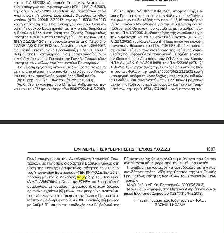 Πέντε χρόνια μετά από εκείνο τον επίμαχο διορισμό, το 2013, ο Λαζαρίδης, που εξακολουθούσε να μην διαθέτει πτυχίο ΑΕΙ, διορίστηκε «σε θέση ειδικού συμβούλου, με σύμβαση εργασίας ιδιωτικού δικαίου ορισμένου χρόνου (6) μηνών, που μπορεί να ανανεώνεται ανά εξάμηνο στο Γραφείο της Γενικής Γραμματέως Ισότητας».