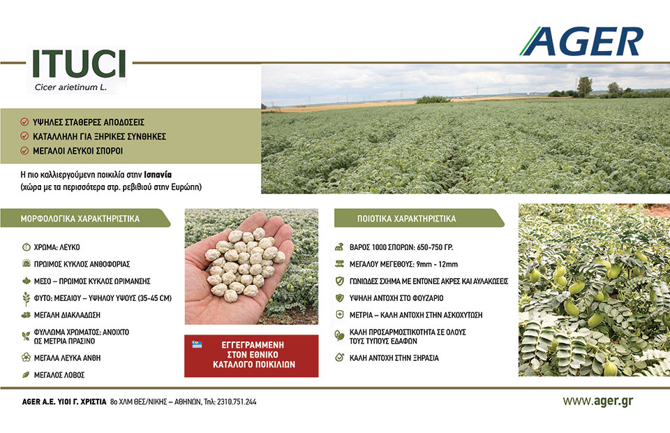 Από αγρονοµικής άποψης, το Ituci χαρακτηρίζεται από πρώιµη ανθοφορία και πρώιµη έως µέση ωρίµανση, προσφέροντας σταθερό και αξιόπιστο κύκλο καλλιέργειας σε µεσογειακές περιοχές. Παρουσιάζει καλή αντοχή στην ξηρασία ενώ προσαρµόζεται σε διαφορετικούς τύπους εδαφών. Παράλληλα, εµφανίζει ανθεκτικότητα σε µυκητολογικές ασθένειες του εδάφους όπως το Fusarium, µειώνοντας την ανάγκη για επεµβάσεις φυτοπροστασίας συµβάλλοντας στην µείωση του κόστους καλλιέργειας . Χαρακτηρίζεται από υψηλό ειδικό βάρος και µέγεθος σπόρων (9-12 µµ ) που τυγχάνει καλύτερης εµπορικής αξίας και αποδοχής στην αγορά ρεβιθιού.