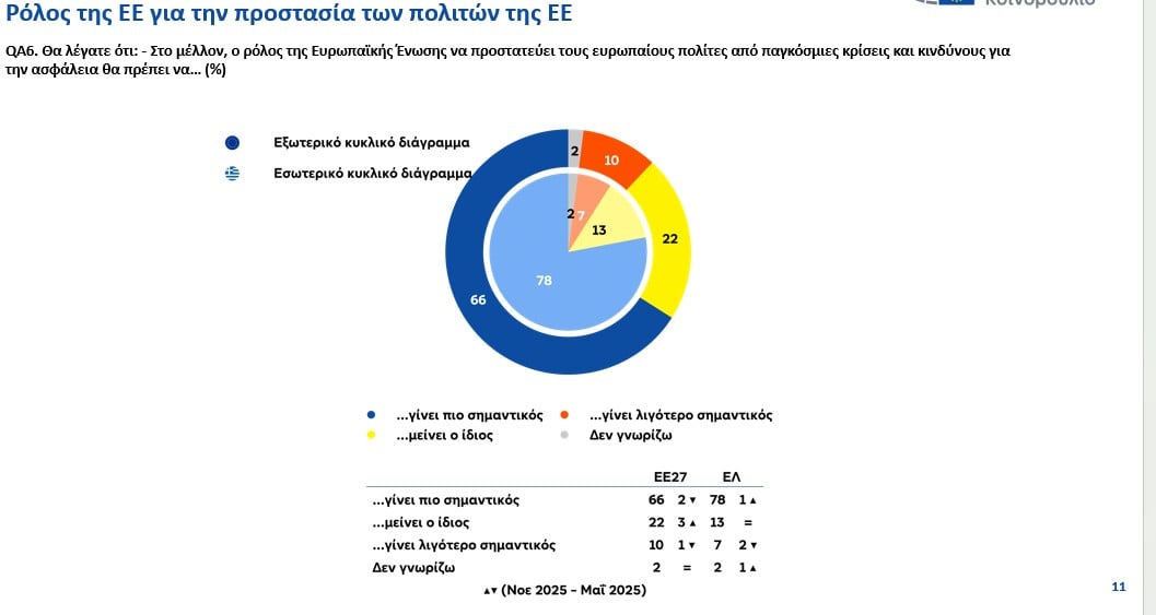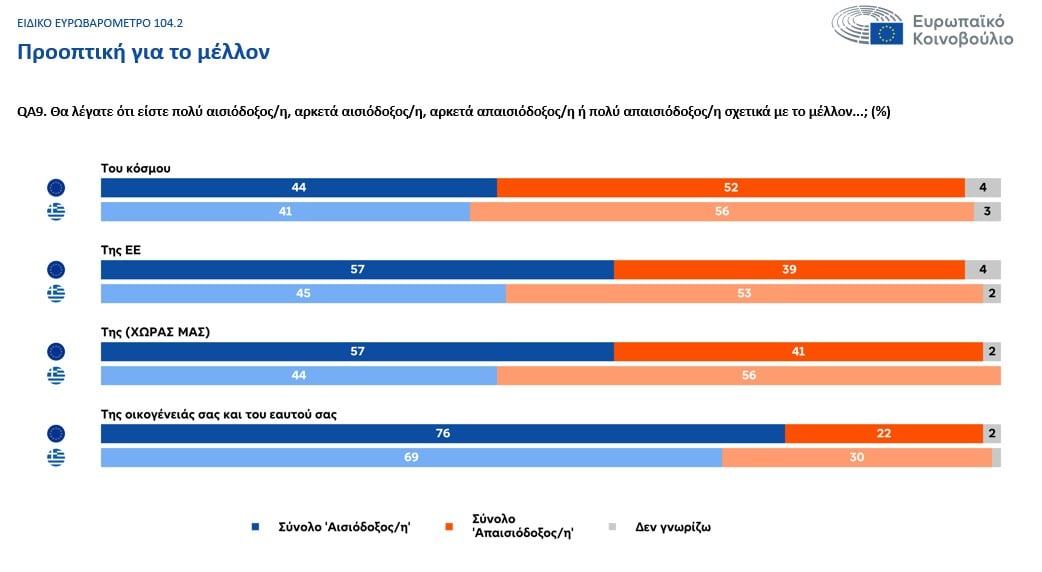 Σε ατομικό επίπεδο, ωστόσο, η εικόνα είναι πιο θετική. Πάνω από τα τρία τέταρτα των πολιτών στην ΕΕ (76%) δηλώνουν αισιόδοξοι για το προσωπικό τους μέλλον και το μέλλον της οικογένειάς τους, με τα ποσοστά να διαμορφώνονται στο 69% στην Ελλάδα και στο 75% στην Κύπρο.