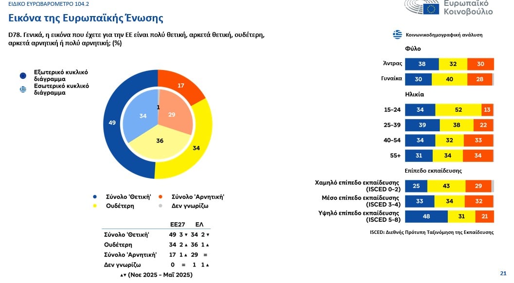 Η στάση των πολιτών απέναντι στην ΕΕ και τα θεσμικά της όργανα παραμένει θετική, παρά τη μικρή επιδείνωση που σημειώθηκε σε σχέση με τον Μάιο του 2025. Η μεγαλύτερη ομάδα πολιτών σε επίπεδο ΕΕ διατηρεί θετική εικόνα για την Ευρωπαϊκή Ένωση (49%, -3 ποσοστιαίες μονάδες), ενώ μόλις το 17% εκφράζει αρνητική άποψη. Στην Ελλάδα, θετική εικόνα για την ΕΕ έχει το 34%, ενώ στην Κύπρο το 42%, με τα αρνητικά ποσοστά να παραμένουν χαμηλά (29% και 18%).