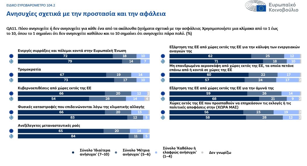 Σημειώνεται ότι για την Ελλάδα, σε αντίθεση με τον μέσο όρο της ΕΕ, στην κορυφή της λίστας βρίσκονται πρώτα οι ανεξέλεγκτες μεταναστευτικές ροές (84%), οι φυσικές καταστροφές που επιδεινώνονται από την κλιματική αλλαγή (83%), ποσοστό πάνω από τον μέσο όρο, και μετά οι ενεργές συρράξεις και πόλεμοι κοντά στην ΕΕ (79%), η τρομοκρατία (73%) και η ενεργειακή εξάρτηση της ΕΕ από χώρες εκτός της Ένωσης (71%).