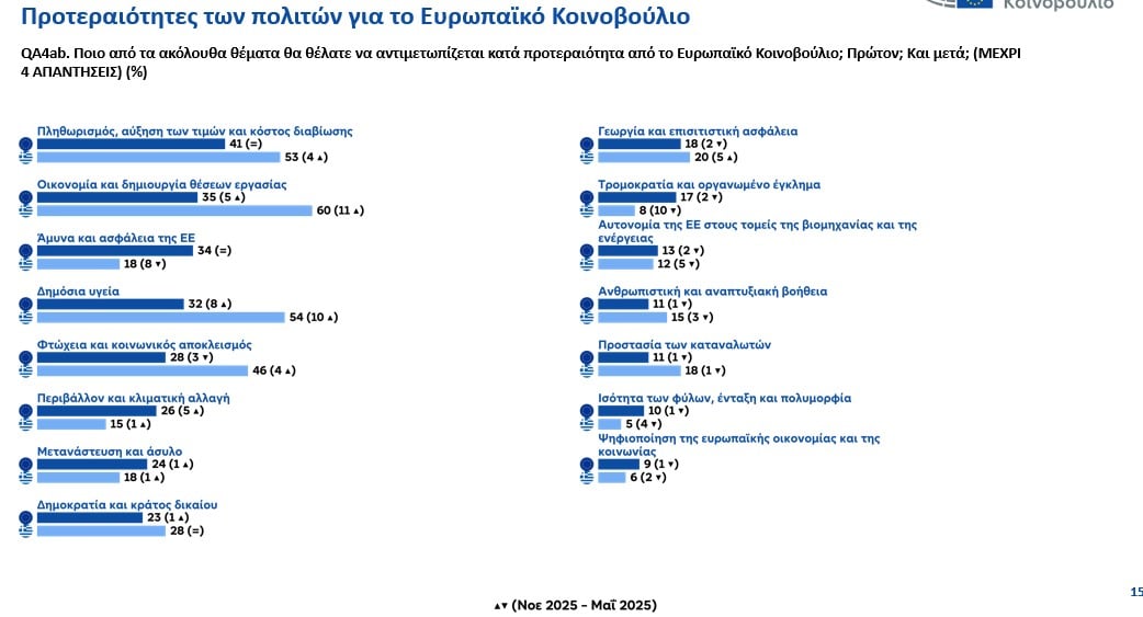 Όσον αφορά τις εσωτερικές πολιτικές της ΕΕ, το 41% των ερωτηθέντων αναφέρει τον πληθωρισμό, την ακρίβεια και το κόστος διαβίωσης ως την κορυφαία προτεραιότητα που επιθυμούν να αντιμετωπίσει το Ευρωπαϊκό Κοινοβούλιο, με τα ποσοστά να ανέρχονται στο 53% στην Ελλάδα και στο 34% στην Κύπρο.