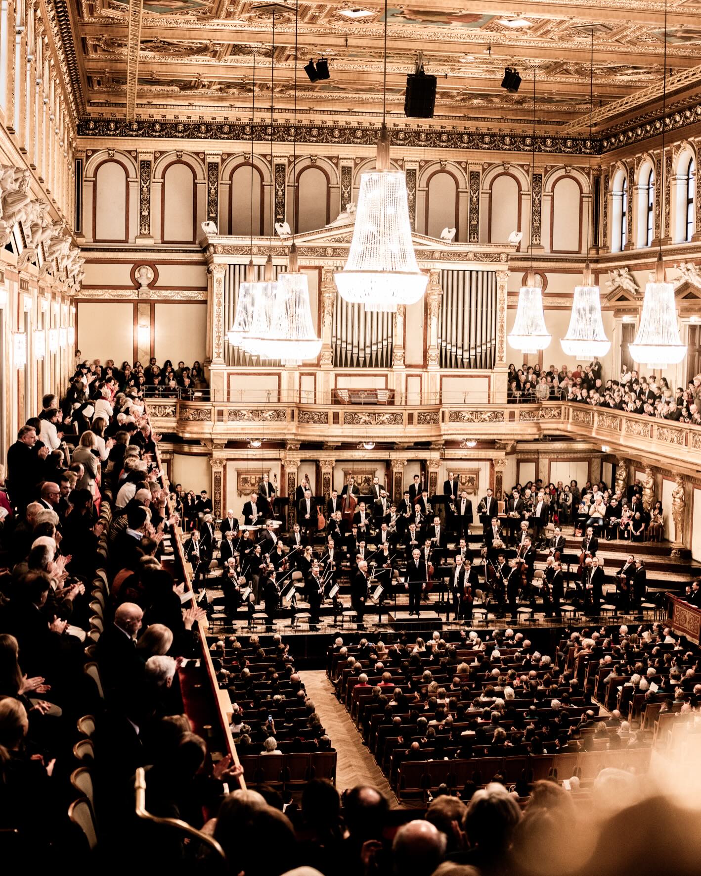 Η χρυσοποίκιλτη αίθουσα στο βιεννέζικο Μέγαρο Φίλων της Μουσικής, η οποία έχει 49 μέτρα μήκος, 19 μέτρα πλάτος και 18 μέτρα ύψος, την ημέρα της Συναυλίας διακοσμείται με 30.000 λουλούδια από τους Κήπους του δήμου της Βιέννης. Σε ένα sold out event όπως η πρωτοχρονιάτικη συναυλία, φιλοξενεί 1744 καθισμένους ακροατές και 300 όρθιους.