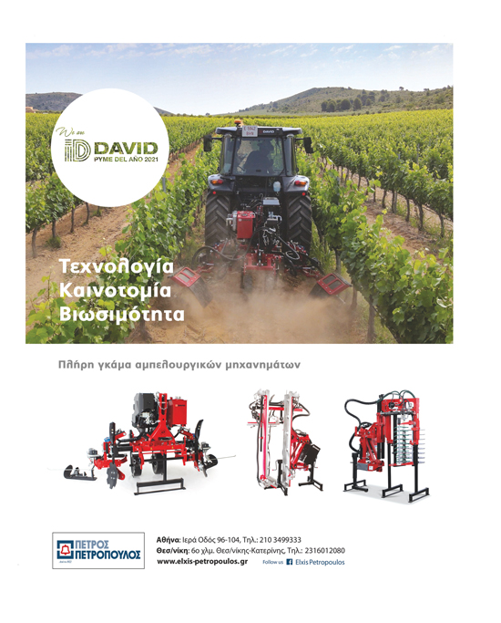 Η ID DAVID, ιστορική ισπανική εταιρεία µε παρουσία από το 1917, έχει καθιερωθεί ως κορυφαία στο χώρο των µηχανηµάτων αµπελουργίας, προσφέροντας εξοπλισµό υψηλής τεχνολογίας που συνδυάζει ακρίβεια, αντοχή και αποτελεσµατικότητα. Η φιλοσοφία της εταιρείας επικεντρώνεται στην ανάπτυξη µηχανηµάτων που κάνουν τη δουλειά του αµπελουργού πιο εύκολη, ταχύτερη και πιο αποτελεσµατική, ενώ παράλληλα µειώνουν τη φθορά στα φυτά και εξοικονοµούν χρόνο και κόστος.