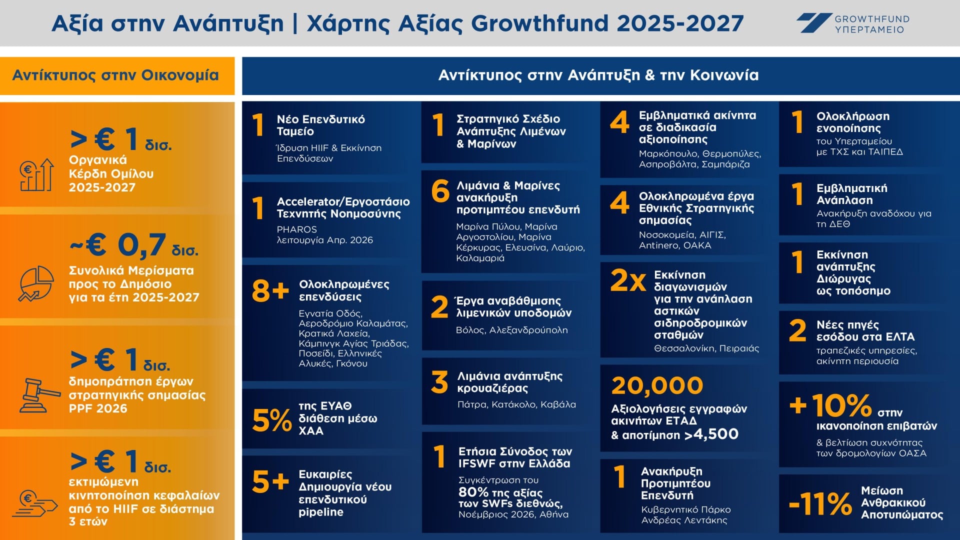 Οι στόχοι της τριετίας 2025–2027 καταγράφονται στον «Χάρτη Αξίας» του Υπερταμείου, που περιγράφει τον αντίκτυπο που θα έχει η υλοποίηση του συνολικού στρατηγικού πλάνου.