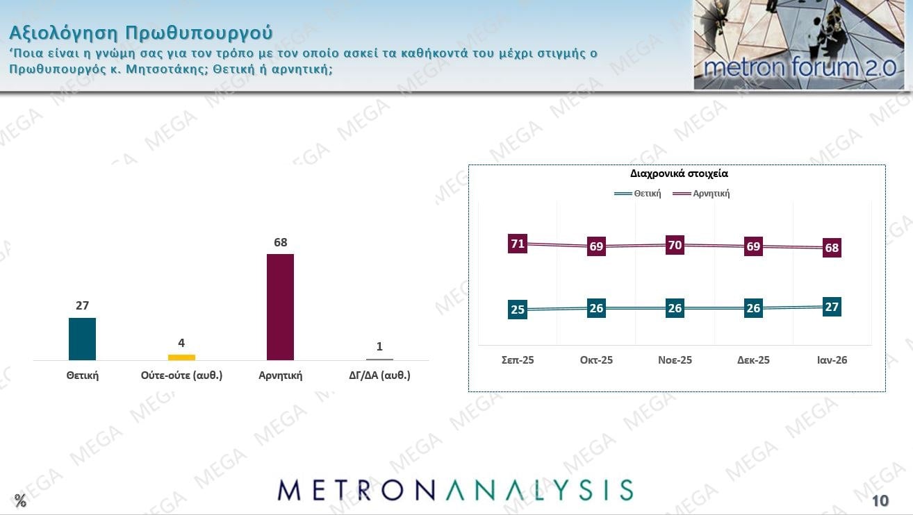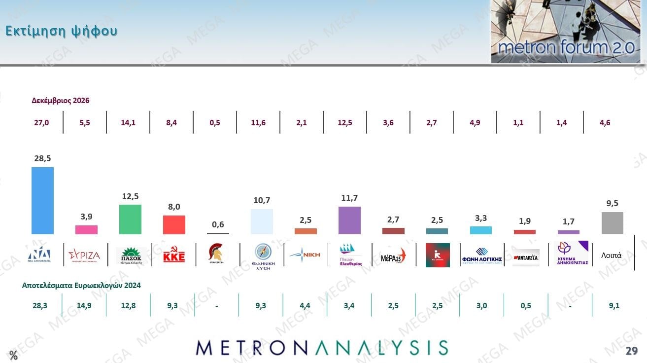 Σύμφωνα με την έρευνα της Metron Analysis, για λογαριασμό του Mega, στην πρόθεση ψήφου η ΝΔ είναι στο 22,3%, το ΠΑΣΟΚ 9,8%, η Πλεύση Ελευθερίας 9,2%, η Ελληνική Λύση 8,4%, το ΚΚΕ 6,3%, ο ΣΥΡΙΖΑ 3%, η Φωνή Λογικής 2,6%, το ΜέΡΑ25 2,1%, η Νίκη 2%, η Νέα Αριστερά 1,9%, η ΑΝΤΑΡΣΥΑ 1,5%, το Κίνημα Δημοκρατίας 1,3%, οι Σπαρτιάτες 0,5%, Λοιπά 7,4%, το σύνολο της Αδιευκρίνιστης Ψήφου είναι στο 11,7%.