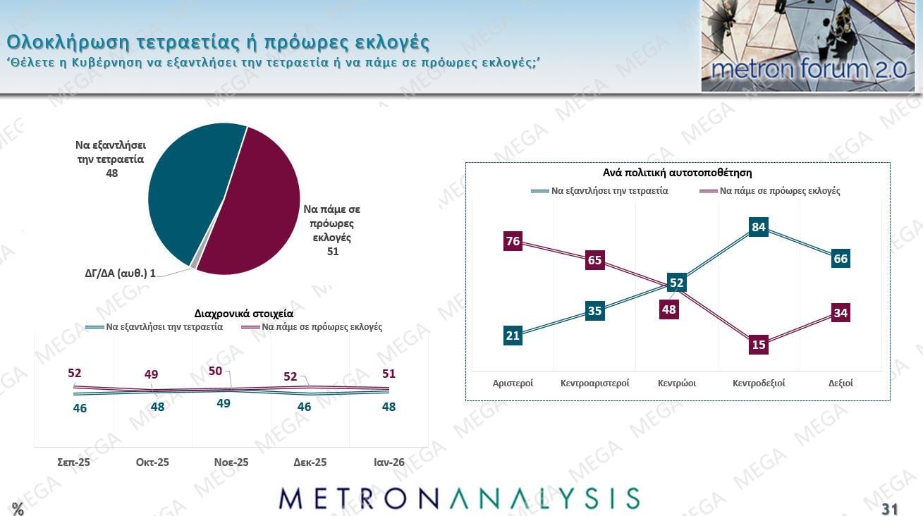 Διχασμένο εμφανίζεται το εκλογικό σώμα ως προς το ενδεχόμενο πρόωρης προσφυγής στις κάλπες. Ειδικότερα, το 51% λέει «να πάμε σε πρόωρες εκλογές», ενώ το 48% δηλώνει ότι επιθυμεί η τωρινή κυβέρνηση «να εξαντλήσει την τετραετία».