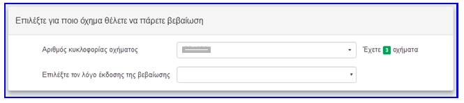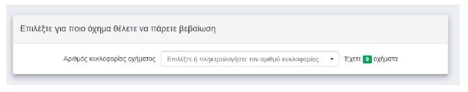 Εικόνα 7. Επιλογή οχήματος και λόγος έκδοσης βεβαίωσης