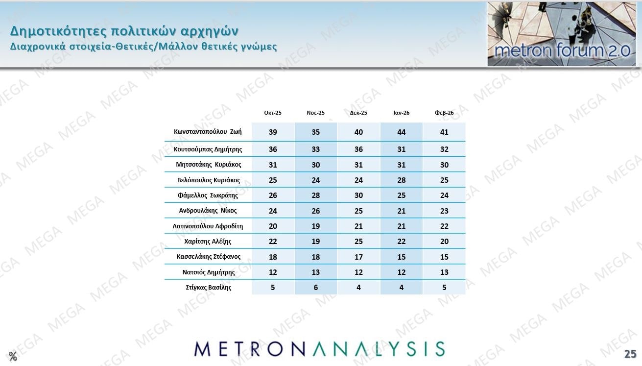 Διψήφια διαφορά άνω των 15 μονάδων διατηρεί η Νέα Δημοκρατία από το ΠΑΣΟΚ στην εκτίμηση ψήφου, σύμφωνα με τη δημοσκόπηση της Metron Analysis.