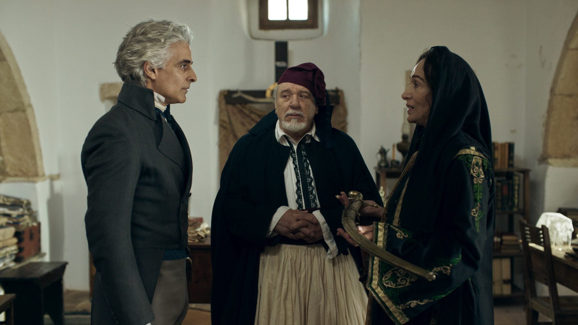 Πρωταγωνιστούν: Καποδίστριας – Αντώνης Μυριαγκός / Μέτερνιχ – Φίνμπαρ Λιντς / Πρωθυπουργός Σπηλιάδης – Τάσος Χαλκιάς / Κολοκοτρώνης – Μάξιμος Μουμούρης / Νικόδημος – Νικορέστης Χανιωτάκης / Ρωξάνδρα – Ηλέκτρα Φραγκιαδάκη / Τσάρος Αλέξανδρος – Δημήτρης Γεωργιάδης / Μαντώ Μαυρογένους – Μαίρη Βιδάλη / Charlotte de Sor – Καίτη Ιμπροχώρη / Κουντουριώτης – Παύλος Κοντογιαννίδης / Πετρόμπεης Μαυρομιχάλης – Μιχάλης Ιατρόπουλος / Αλέξανδρος Μαυροκορδάτος – Νίκος Κορδώνης / Κανάρης – Δημήτρης Δανίκας.