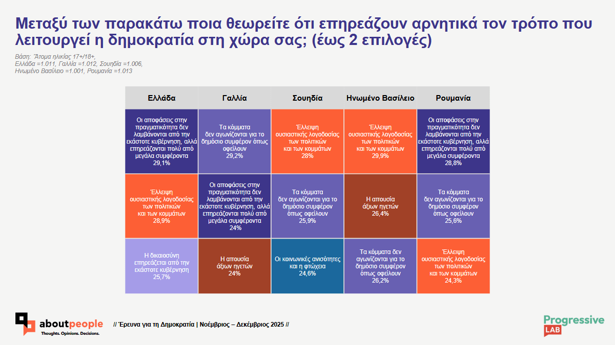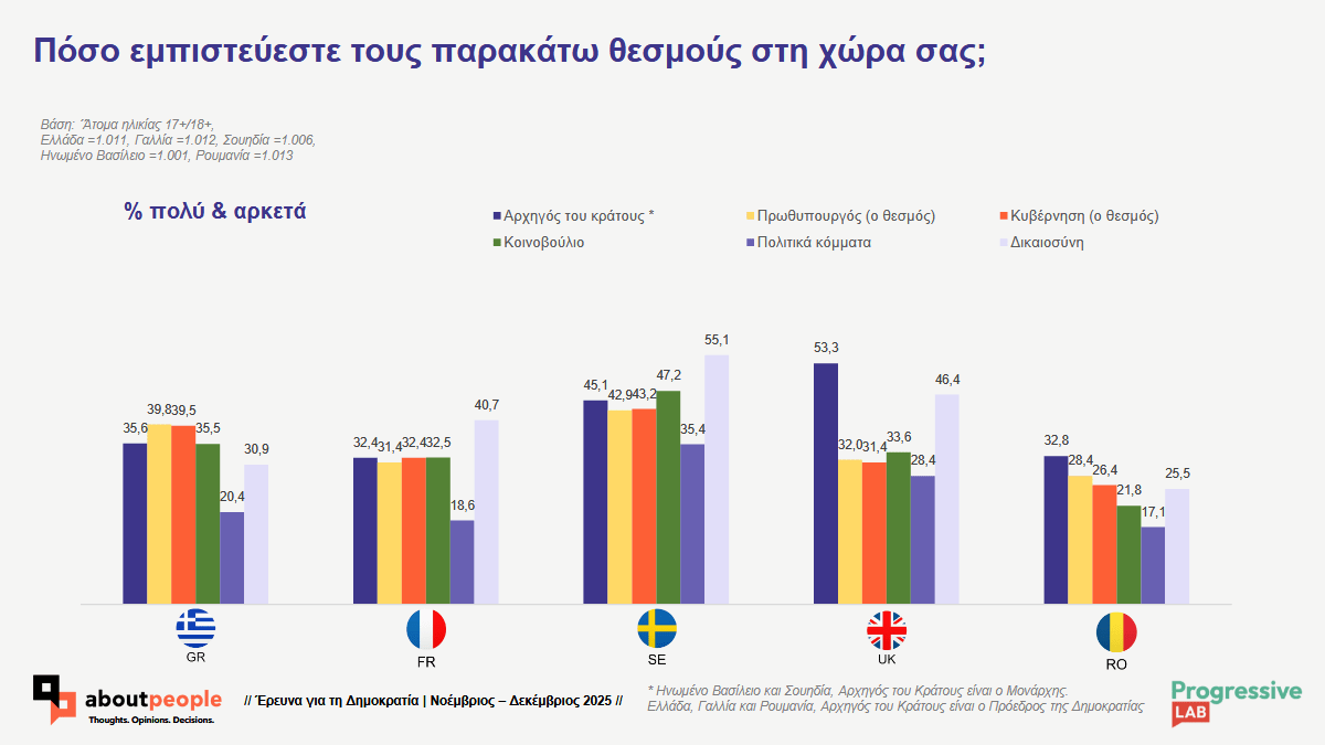 Οι Έλληνες ενδιαφέρονται και συζητούν για την πολιτική, ωστόσο εκφράζουν αυξημένη δυσπιστία απέναντι στον τρόπο λειτουργίας των Θεσμών και τελικά της ίδιας της Δημοκρατίας, σε σύγκριση με πολίτες της Γαλλίας, της Σουηδίας, της Ρουμανίας και του Ηνωμένου Βασιλείου, όπως προκύπτει από έρευνα της aboutpeople για λογαριασμό του think tank Progressive Lab.