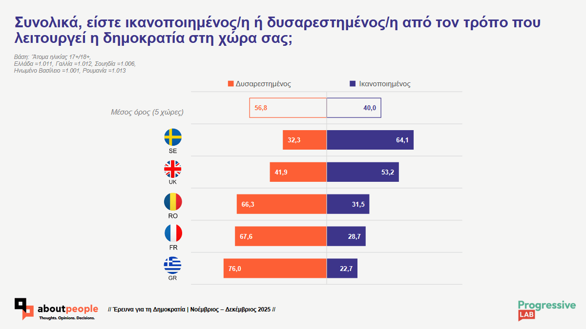 Η ικανοποίηση, ωστόσο, από τον τρόπο που λειτουργεί η δημοκρατία στην κάθε χώρα καταγράφει σημαντικές διαφοροποιήσεις. Στον γενικό μέσο όρο των χωρών αυτών, το 56,8% των ερωτηθέντων δηλώνει δυσαρεστημένο, ενώ το 40% εμφανίζεται ικανοποιημένο. Η Ελλάδα παρουσιάζει την πιο αρνητική εικόνα, καθώς το 76% των πολιτών δηλώνει δυσαρεστημένο και μόλις το 22,7% ικανοποιημένο. Παρόμοια τάση υψηλής δυσαρέσκειας παρατηρείται στη Γαλλία με 67,6% και στη Ρουμανία με 66,3%.