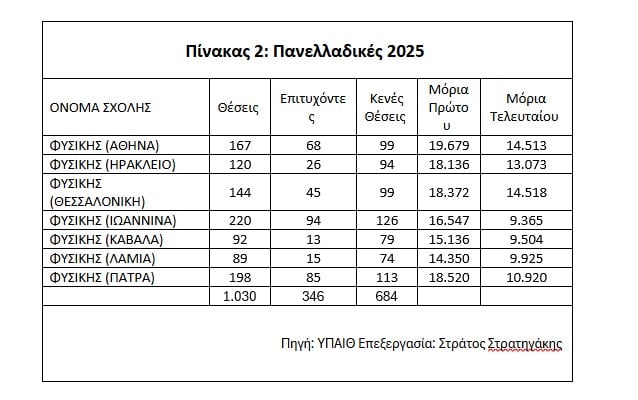 Το ερώτημα είναι γιατί τα Τμήματα Φυσικής. Διότι το πράγμα έφτασε στο απροχώρητο. Όπως βλέπουμε στον πίνακα 2 στις Πανελλαδικές Εξετάσεις του 2025 καλύφθηκε μόνο το 33,59%, δηλαδή μία στις τρεις θέσεις. Και από αυτούς που εισήχθησαν δεν γνωρίζουμε πόσοι θα φοιτήσουν και πόσοι θα αποφοιτήσουν. Οι άλλες δύο στις τρεις έμειναν κενές. Ξαφνικά δηλαδή η Ελλάδα θα ξεμείνει από πτυχιούχους Φυσικής. Αυτό σημαίνει ότι βάσει των θέσεων εισακτέων που ανακοίνωσε το Υπουργείο Παιδείας όλους τους φοιτητές θα μπορούσαν να τους εκπαιδεύσουν τα Τμήματα της Πάτρας και των Ιωαννίνων. Τα υπόλοιπα θα έμεναν χωρίς φοιτητές. Φυσικά αυτό δεν μπορεί ούτε έχει νόημα να γίνει αλλά μας δείχνει το μέγεθος του προβλήματος.