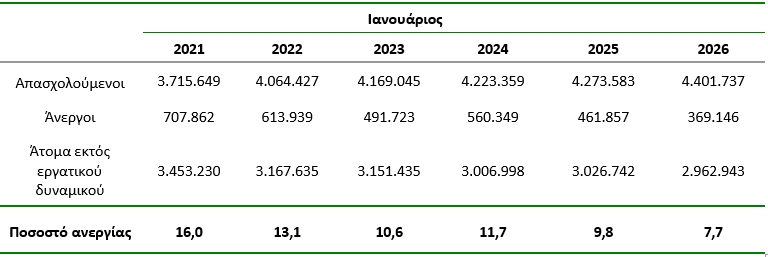 Πίνακας 1: Απασχολούμενοι, άνεργοι, άτομα εκτός του εργατικού δυναμικού και ποσοστό (%) ανεργίας, Ιανουάριος 2021 – 2026