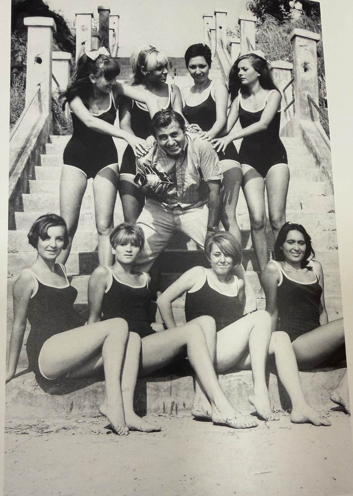 Ο Γιάννης Κυριακίδης με τις υποψήφιες στα βραβεία Μις Θεσσαλονίκη στη σκάλα Αρετσούς τη δεκαετία του ’70
