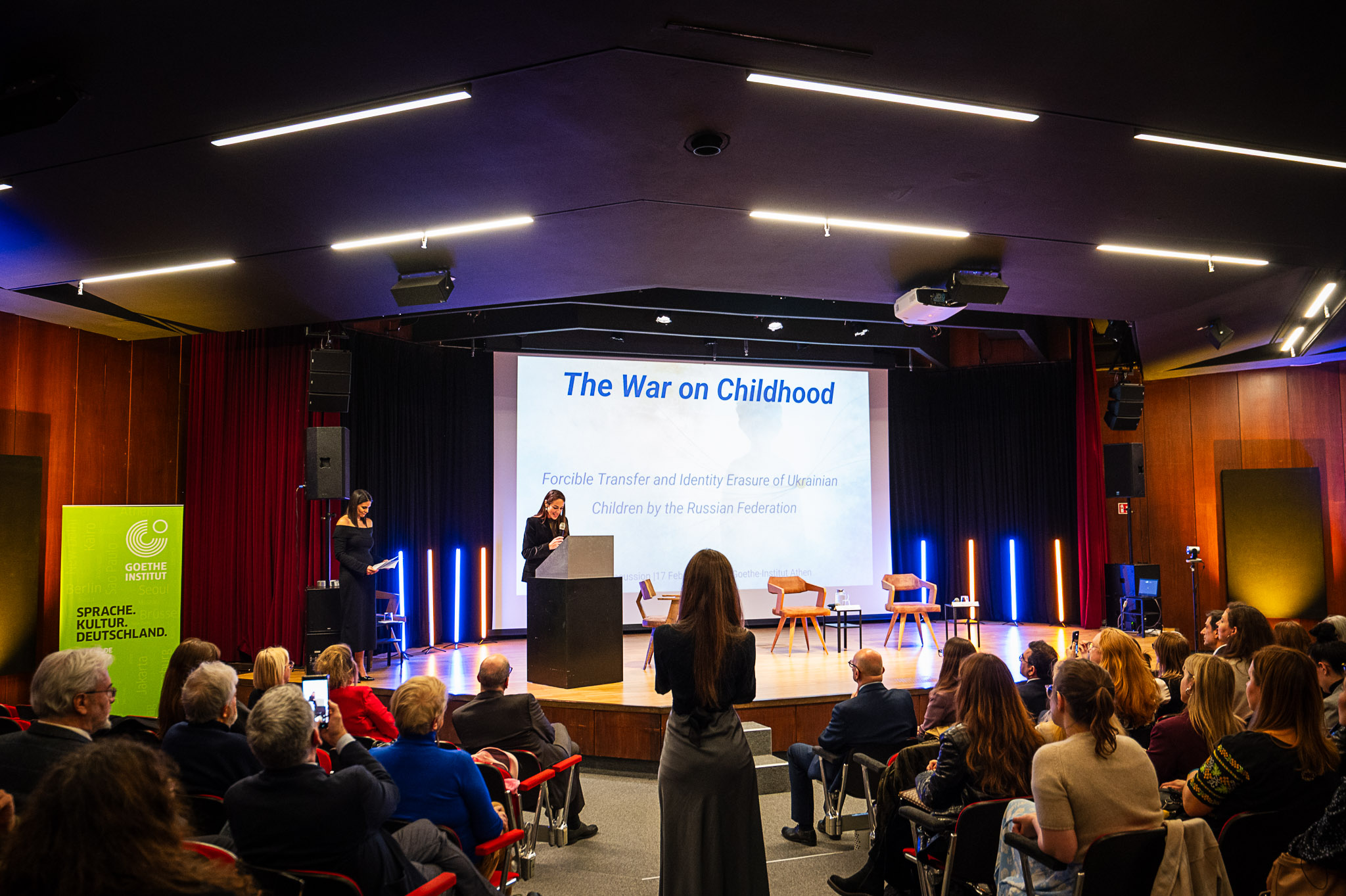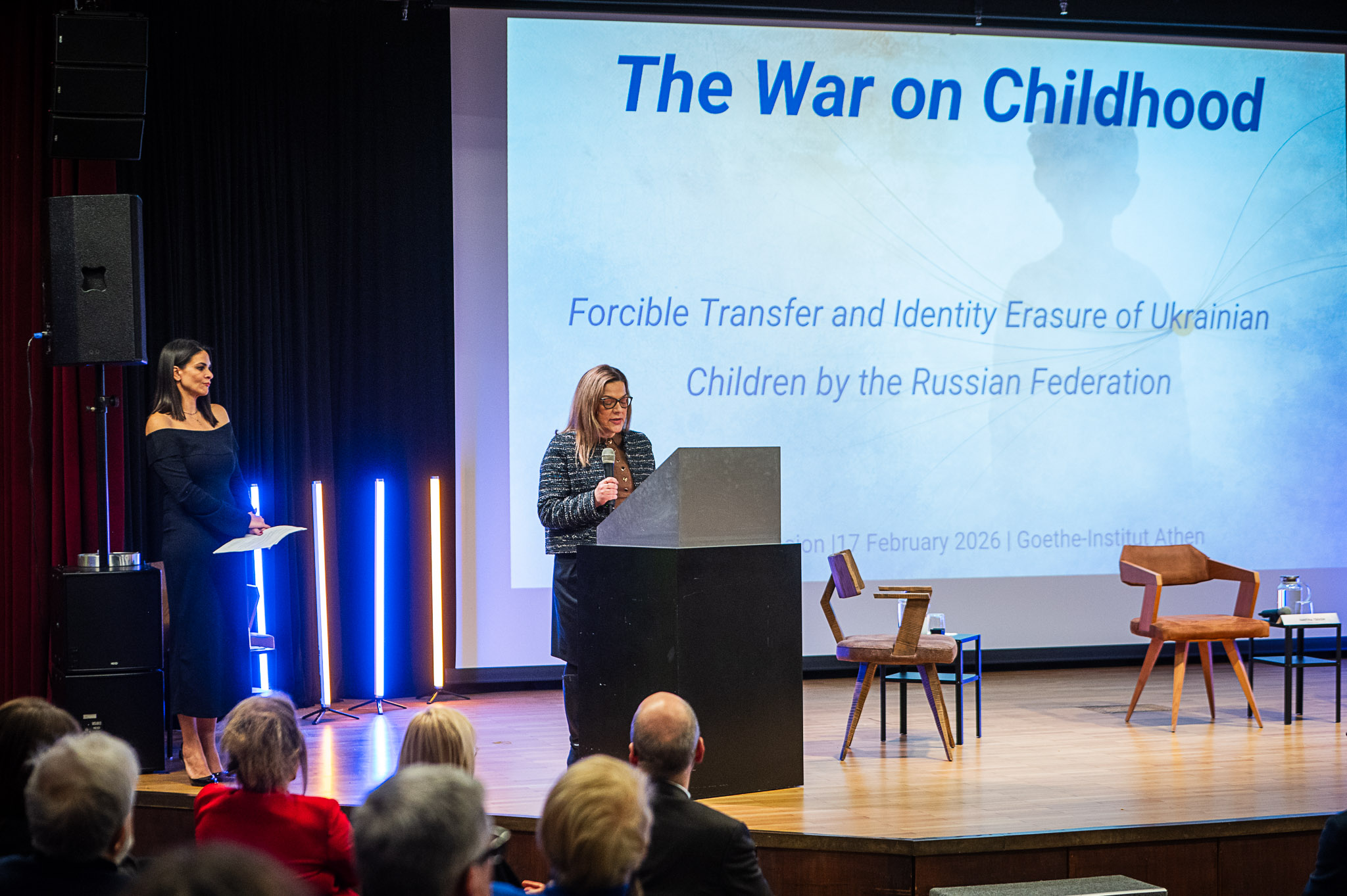 Για το ίδιο θέμα, σύντομη παρέμβαση στην εκδήλωση στο Ινστιτούτο Γκαίτε πραγματοποίησε και η επιτετραμμένη της πρεσβείας της Ουκρανίας στην Ελλάδα, Βίτα Όλετς. «Στις 24 Φεβρουαρίου 2026 συμπληρώνονται 4 χρόνια από τότε που η Ρωσία ξεκίνησε την πλήρους κλίμακας εισβολή της στην Ουκρανία. Όπως μπορείτε να δείτε, συνεχίζουμε τον αγώνα μας για τη δημοκρατία, για την ύπαρξη της Ουκρανίας και των Ουκρανών ως έθνος», τόνισε η ίδια επικεντρώνοντας το υπόλοιπο μέρος της ομιλίας της στο πιο ευάλωτο κομμάτι της κοινωνίας της χώρας της, τα παιδιά της Ουκρανίας. «Χιλιάδες από αυτά σκοτώνονται ή τραυματίζονται ή απαγάγονται από τη Ρωσική Ομοσπονδία. Αλλά μαζί έχουμε ακόμα την ευκαιρία να σώσουμε πολλά από αυτά. Ο Πρόεδρός μας Βολοντίμιρ Ζελένσκι τόνισε ότι η μοίρα των αναγκαστικά εκτοπισμένων παιδιών είναι η νούμερο ένα προτεραιότητα για όλους μας. Χρειαζόμαστε ένα σαφές μητρώο αυτών των παιδιών και εργαζόμαστε πάνω σε αυτό. Είναι εξαιρετικά δύσκολο να βρούμε πληροφορίες εντός της Ρωσίας σχετικά με το πού βρίσκονται τα παιδιά μας και γι’ αυτό η υποστήριξη των συντρόφων είναι ζωτικής σημασίας για τον εντοπισμό αυτών των παιδιών. Μαζί με τους εταίρους μας από τον Διεθνή Συνασπισμό για την Επιστροφή των Παιδιών της Ουκρανίας, καταφέραμε να επιστρέψουμε στην πατρίδα μας περίπου 1.980 παιδιά. Δεν είναι πάρα πολύ, αλλά κάθε επιστροφή, ακόμα και για 1 ή 3 ή 10 παιδιά είναι μια πραγματική επιτυχία, αλλά και μια πρόκληση, γιατί τα παιδιά πρέπει να επανενταχθούν και να προστατευτούν από το τραύμα που έχουν περάσει. Από αυτή την άποψη, θα ήθελα να ευχαριστήσω τον Καναδά, συμπρόεδρο του Διεθνούς Συνασπισμού για την Επιστροφή των Παιδιών της Ουκρανίας, για την υποστήριξη της αποστολής μας και, φυσικά, για τη συνδιοργάνωση αυτής της εκδήλωσης. Θα ήθελα επίσης να εκφράσω την ευγνωμοσύνη μας σε όλες τις χώρες που έλαβαν ενεργές θέσεις και συνέβαλαν στην επιστροφή των παιδιών από την Ουκρανία. Η δέσμευση και η αλληλεγγύη σας, δίνουν ελπίδα σε οικογένειες σε όλη την Ουκρανία. Θα ήθελα επίσης να ευχαριστήσω την Ελλάδα που είναι μαζί μας στον Διεθνή Συνασπισμό, καθώς και για την παροχή προσωρινής προστασίας σε χιλιάδες παιδιά από την Ουκρανία και τις οικογένειές τους».