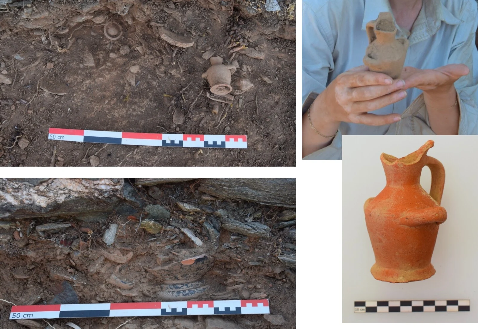 Θραύσματα αγγείων και άλλων κινητών ευρημάτων (ανάμεσα σε αυτά χάλκινο νόμισμα Φιλίππου Β’ και κεφαλή γυναικείου ειδωλίου) από το εσωτερικό του Συλλεκτήρα Δ(φωτ. Εύας Κολοφωτιά)