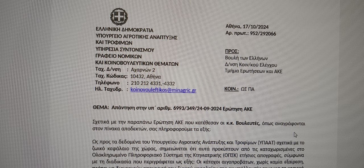 Κατά παρέκκλιση από τα ειωθότα, σχεδόν έναν μήνα αργότερα, στις 17 Οκτωβρίου του 2024, το ΥΠΑΑΤ μέσω του υφυπουργού Χρήστου Κέλλα επιλέγει να απαντήσει στη συγκεκριμένη ερώτηση.